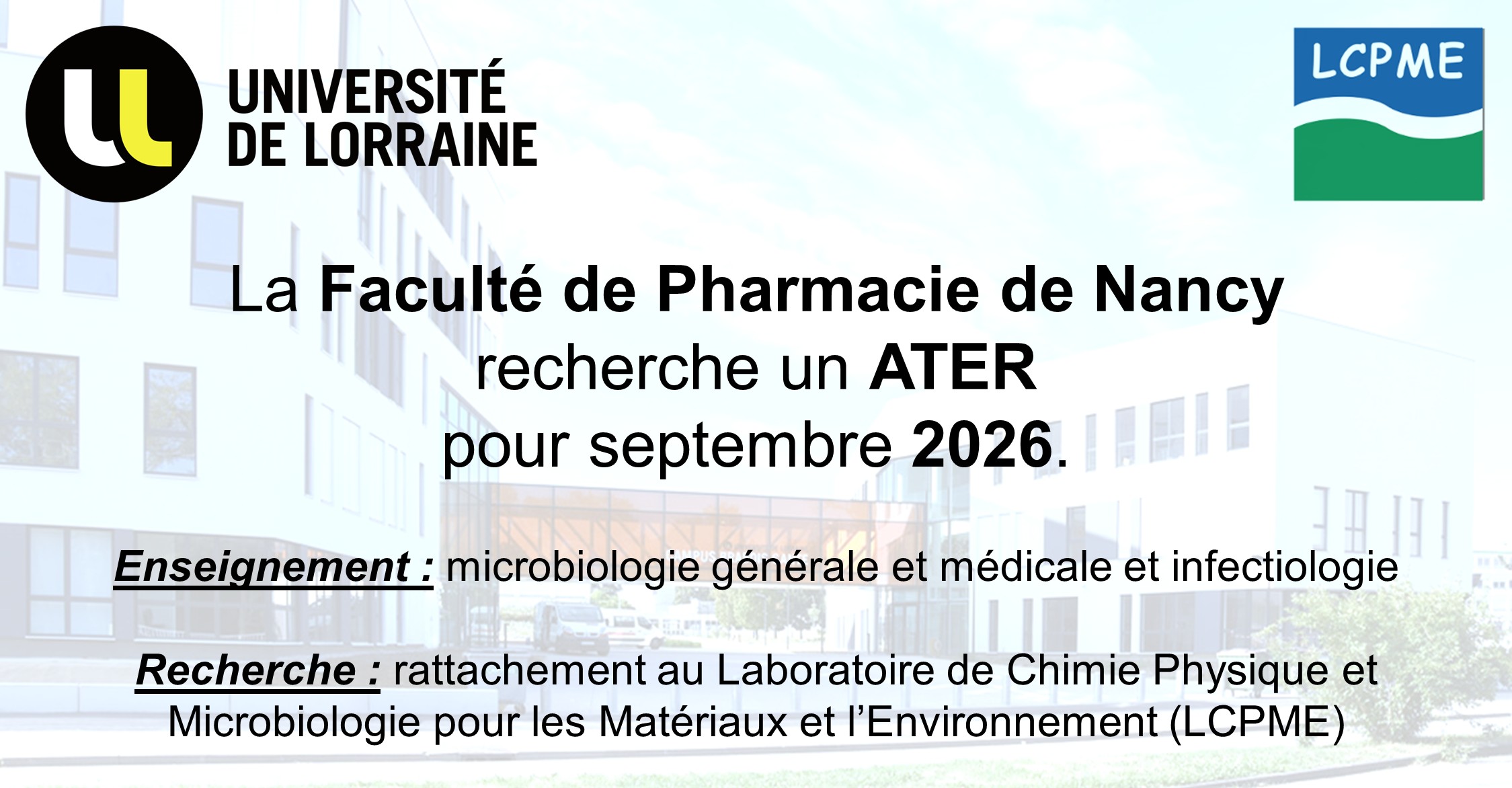 La Faculté de Pharmacie de Nancy recherche un ATER pour septembre 2026.